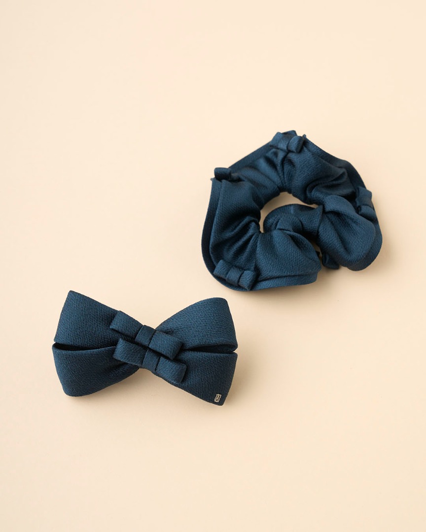 シュシュの縁や、リボンバレッタの中心にミニリボンが飾られたユニークなデザインです。