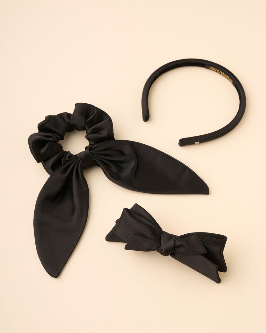 光沢のあるなめらかなシルクサテンのカチューシャ、シュシュ、バレッタ。
